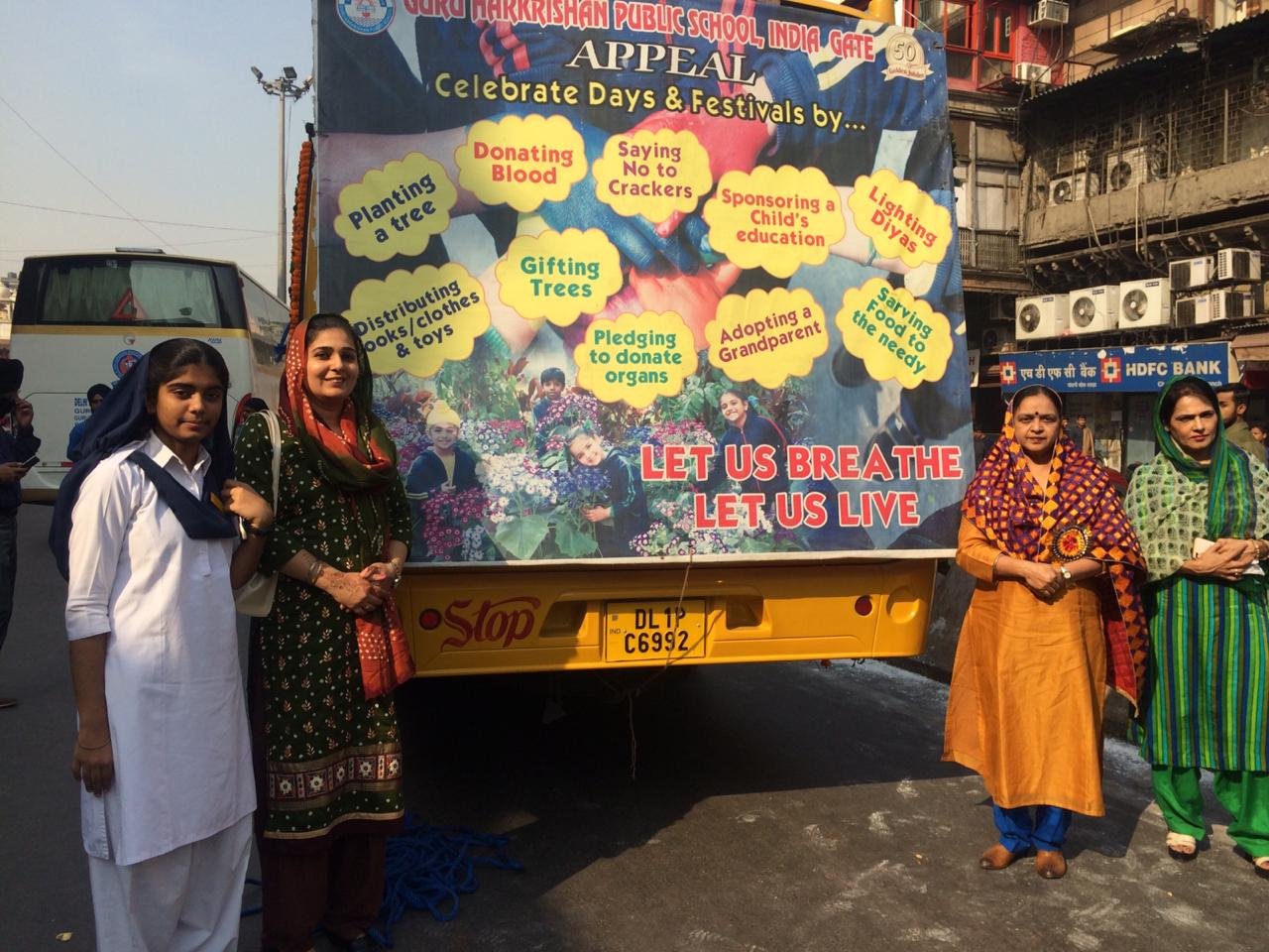 An impressive Nagar Kirtan, under the aegis of the Delhi Sikh Gurudwara Management Committee, was organized to mark the 548 birth anniversary of the first Guru of Sikhs, Shri Guru Nanak Dev Ji on Saturday ,12 November 2016 . The students carried placards in the Nagar Kirtan creating an awareness on the epilogue uttered by Guru Nanak Dev Ji _ Pavan Guru Paani Pita, Mata Dharat Mahat. A signature campaign was carried out by the students of the school which was signed by thousands of spectators. They appealed to the general public to gift a safe and healthy environment to them and refrain from bursting crackers. A huge flex suggesting alternative methods of celebrating festivals and happy occasions _ by planting trees, helping the needy, sponsoring a child,s education, pledging to donate organs _ was the center of attraction and drew accolades from the spectators. It truly was a NAGAR KIRTAN with a difference.