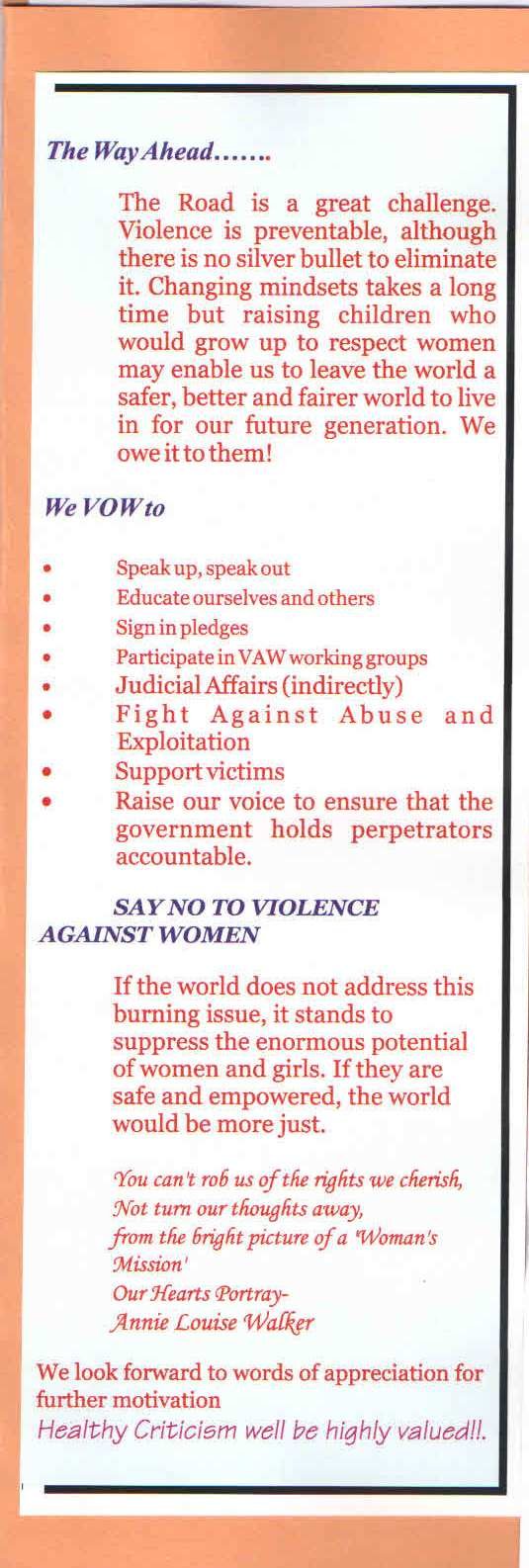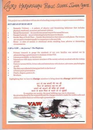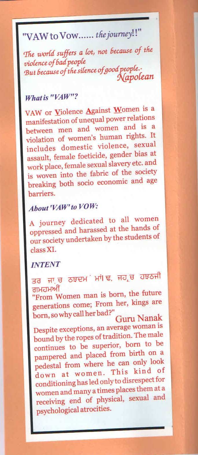 'VAW to Vow ....... the journey ' is one such programme which is the culmination of a two month long research project undertaken by the enthusiastic students of class XI as a part of their General Studies subject, based on violence against women (VAW).