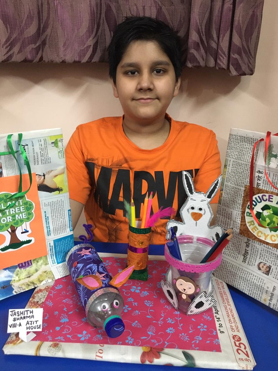 Students were asked to make colorful handmade paper bags promptly the use of paper bags instead of plastic bags to reduce pollution a save environment. Advay of class V-C from Baba Jujhar Singh bagged the 1st Position. The 2nd Position was won by Jaskeerat Kaur of Class IV-B from Baba Fateh Singh House and Prabhjot Singh of Class V-A from Baba Jujhar Singh House got the 3rd Position.