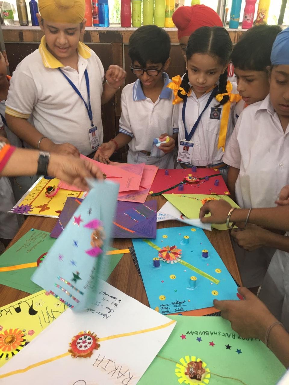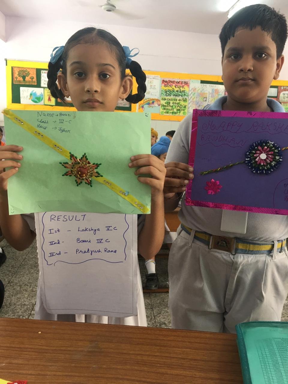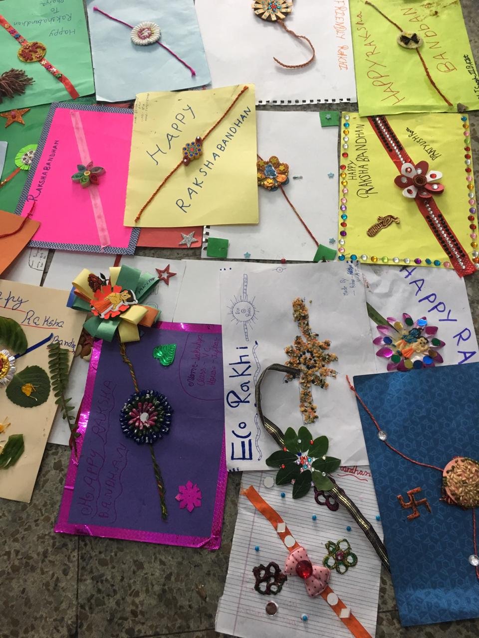 An Inter house Eco friendly Rakhi Making Competition for classes III to V was organised in the school premises on 26 Aug 2015. Numerous novel ideas were floated by the students in this competition. Flowers and leaves Pulse and cereals replaced all gaudy plastics. Softs ribbons feathers cotton --- the lict found its way into the rakhi .