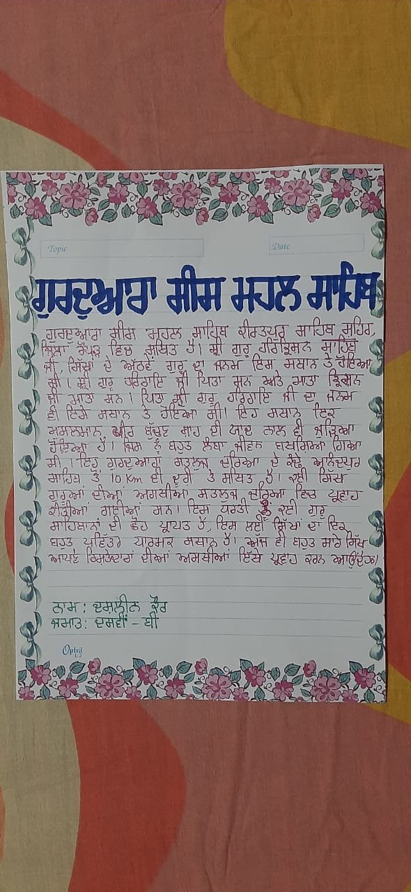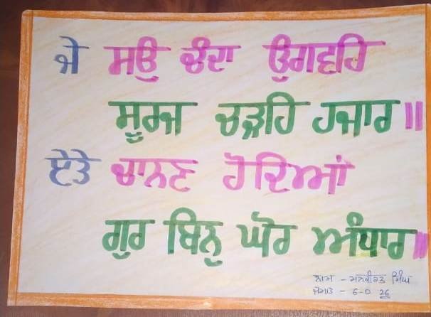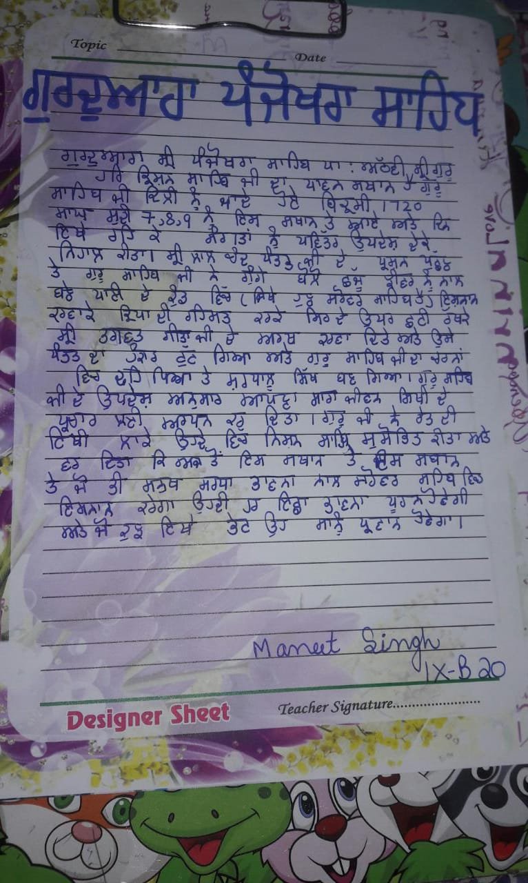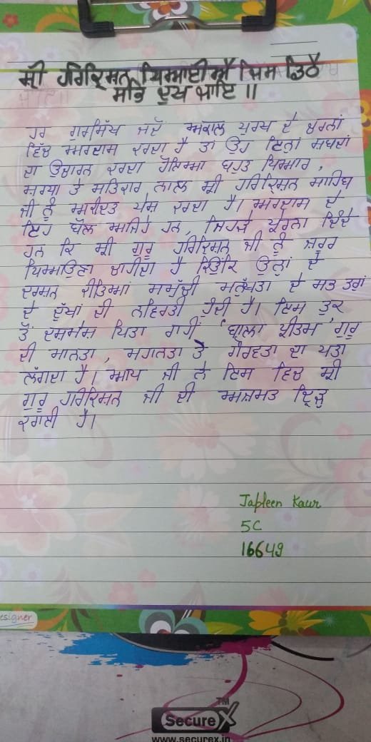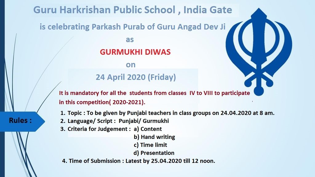The school celebrated Prakash Purab of Guru Angad Dev Ji as Gurmukhi Diwas on 24th April 2020. All the students of classes IV to VIII participated whole-heartedly in the essay writing competition on the topic "Guru Angad Dev Ji's life, his teachings and his standardizing the Gurmukhi script". School Principal Ms. Mandeep Kaur encouraged the students to emulate the teachings of the Guruji and become better citizens. She also appreciated the efforts of the Punjabi teachers to make this competition a success.