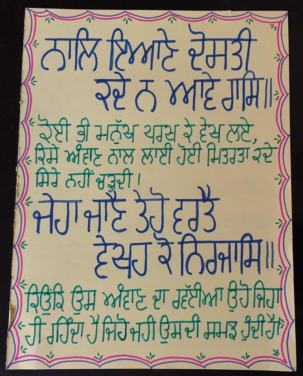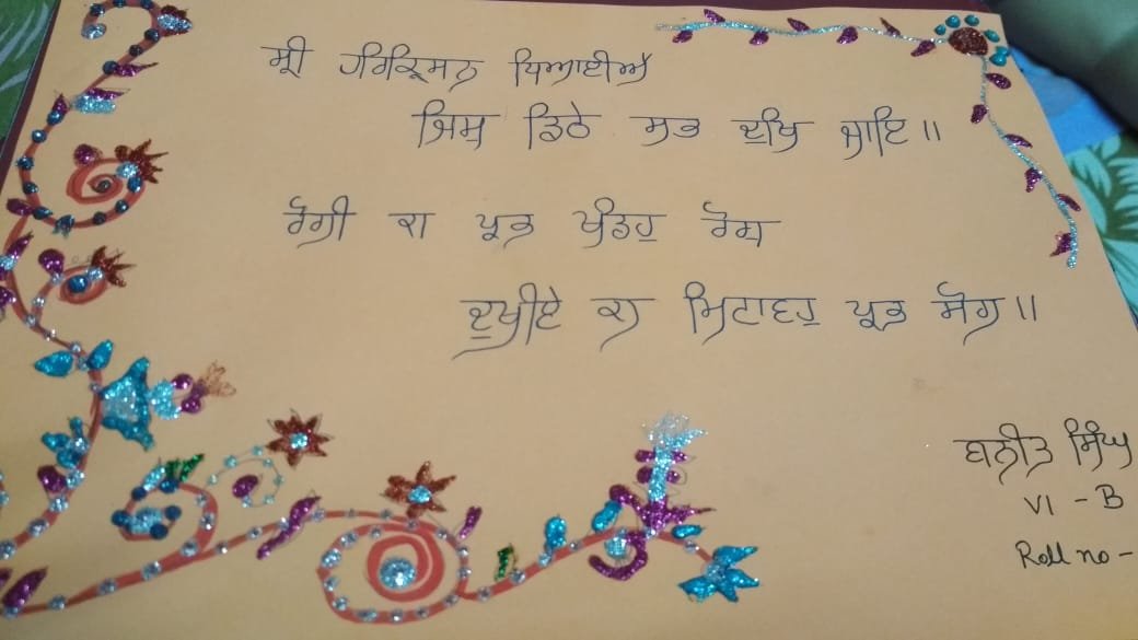 Students of classes 6th, 7th, 8 th and 9th drew pictures of 5 kakkars, made Baisakhi greeting cards and wrote a brief description on Guru Gobind Singh Ji and Khalsa Panth. The following pictures showcase the creativity of the students.