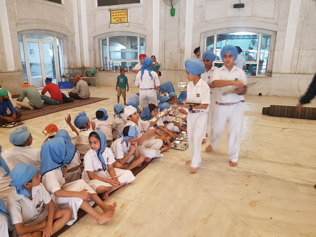 For people visiting Anandpur Sahib, langars (voluntary community kitchens) are organized by the local people as a part of sewa (community service). Raw materials like wheat flour, rice, vegetables, milk and sugar are provided by the villagers living nearby. Women volunteer to cook and others take part in cleaning utensils and other manual tasks that need to be carried out. Traditional cuisine is served to the pilgrims who eat while sitting in rows on the ground. (Pangat)