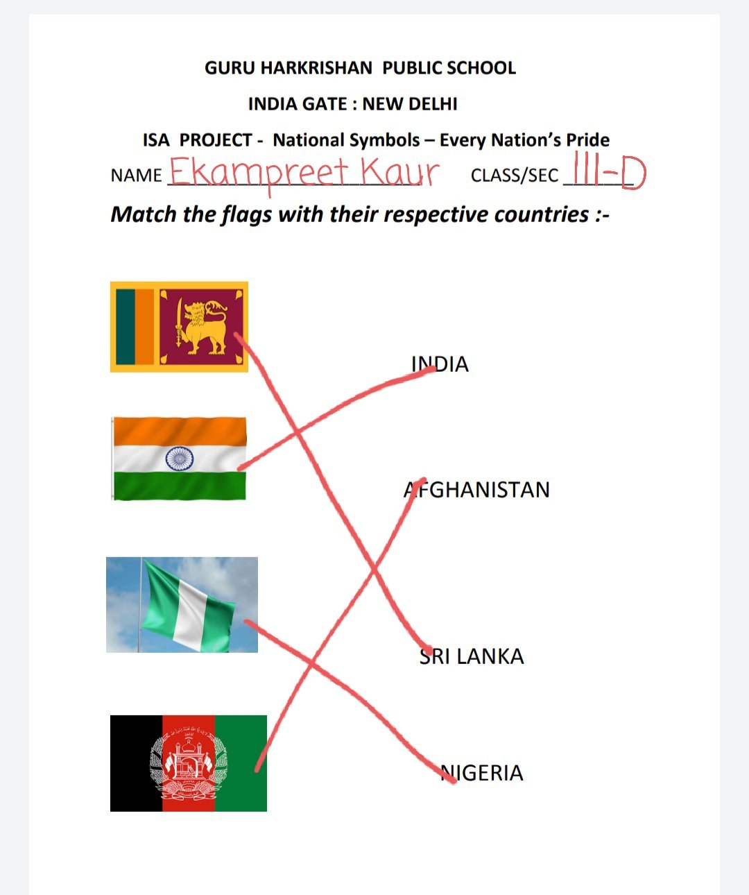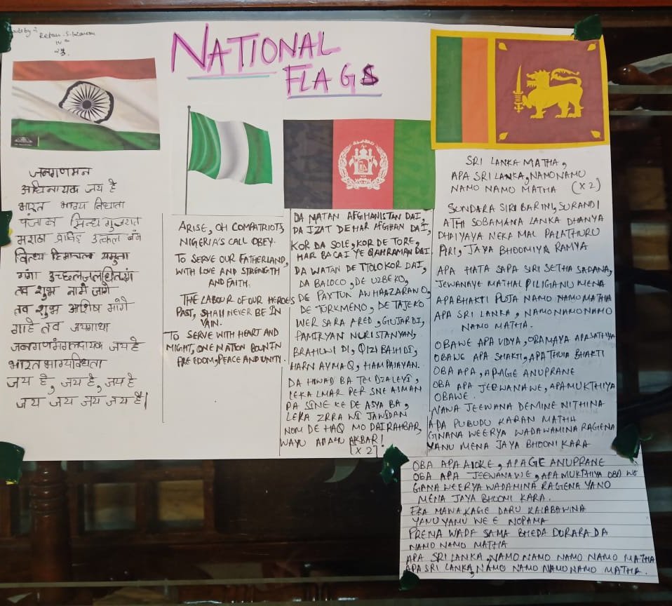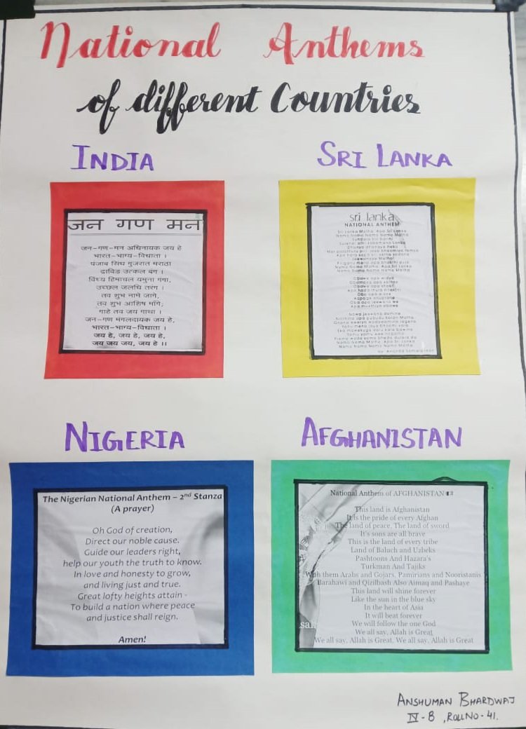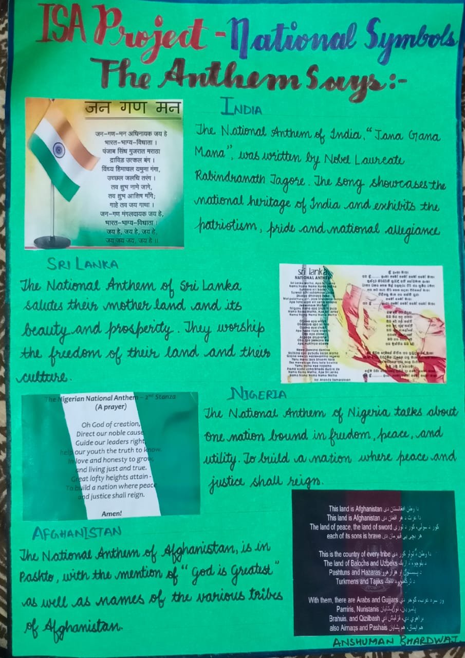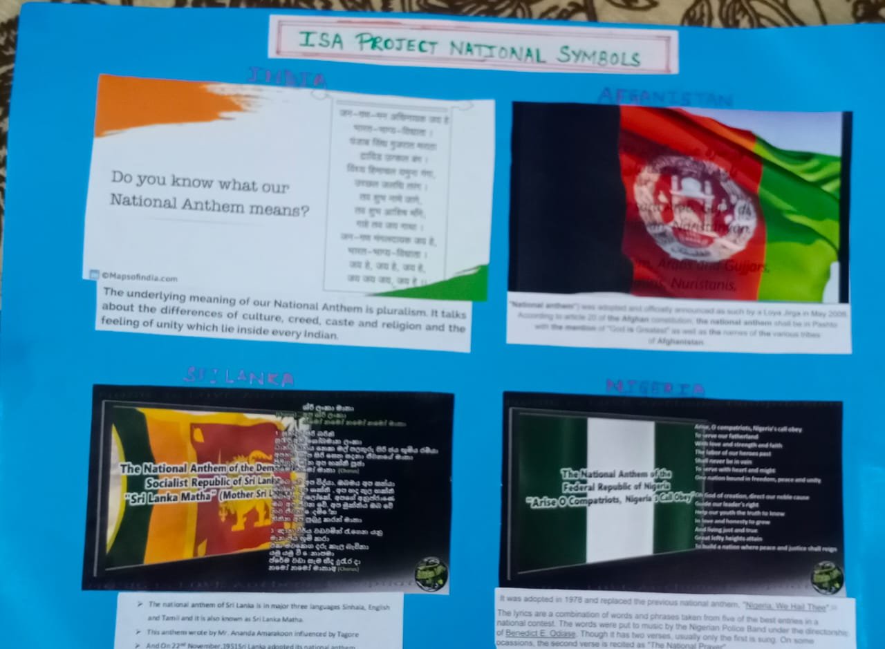 To inculcate the feeling of respect for national symbols our intellects of class 3 and 4 successfully completed the International School Award Project on "National Symbols - Every Nation's Pride". The project started with PowerPoint Presentation on national symbols of India. Thereafter, the students did extensive research on the flags of India, Afghanistan, Sri Lanka and Nigeria. They found out about the shape, size, color and the meaning of each color in the flag. They also worked on national anthems of respective countries where they found out about the time duration of the anthem, the posture to be maintained while singing the national anthem, and what does the anthem talk about. They presented their research through beautiful and creative scrapbooks and charts. Their Knowledge or learning was assessed through online quiz and worksheets. The visit to Gandhi Museum acquainted students about the historical connections of their national flag 'Tiranga' with Gandhi Ji. This memorable visit to the Museum was all on all a novel, enriching and enjoyable experience. In conclusion, the project was an informative and interesting venture for students as well as for teachers.