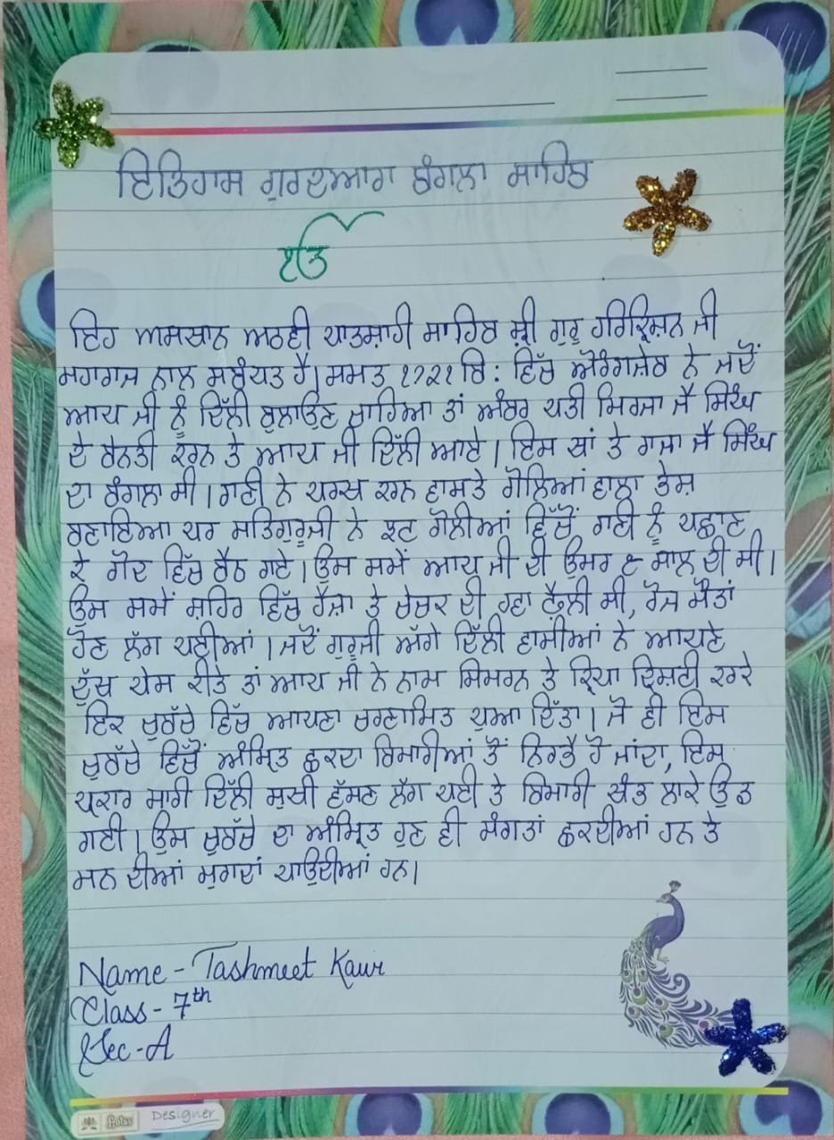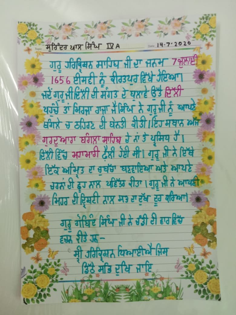On the auspicious occasion of the Prakash Purab of our eighth Guru ,Sri Guru Harkrishan Sahib ji, many competitions were conducted online. All the students participated and exhibited their talent by reciting poems and Sakhi on the life of Guru ji. They wrote essays and poems on the history and importance of Gurdwara Bangla Sahib Ji.