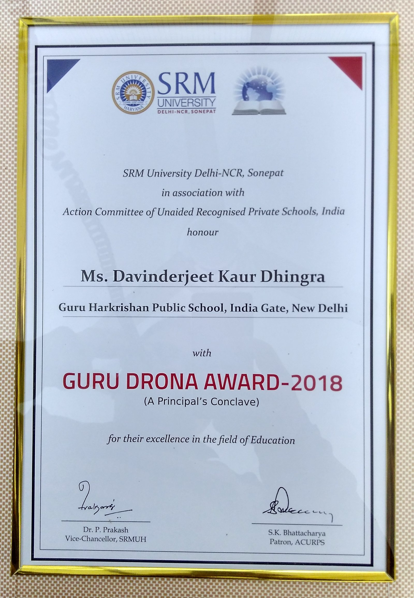 Principal, Ms. D. K. Dhingra conferred with GURU DRONA AWARD-2018, for her valuable contribution to the field of Education at the Principal's Conclave held at The Metropolitan Hotel on 14 December 2018.