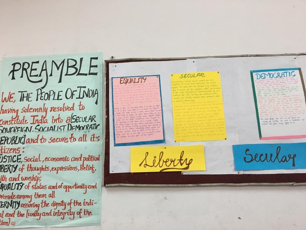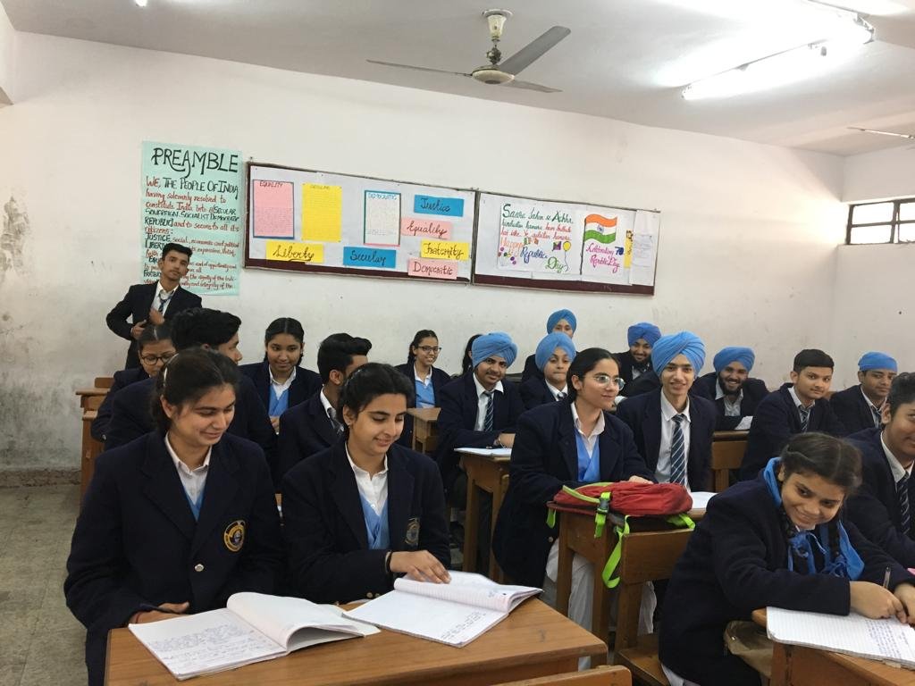 Constitution @70 campaign was organised in the school during the second week of February 2019. This was done under the aegis of Directorate of Education in order to connect the students with the values covered in the constitution of India particularly frames in its preamble so that they can acknowledge and imbibe them in their everyday life and become politically aware and empowered citizens of India. All the students of class 11A were involved in the project. They were asked to write their views on a number of themes . Tushar of class 11A highlighted his views on Equality. It was an interactive session which benefitted all the students.