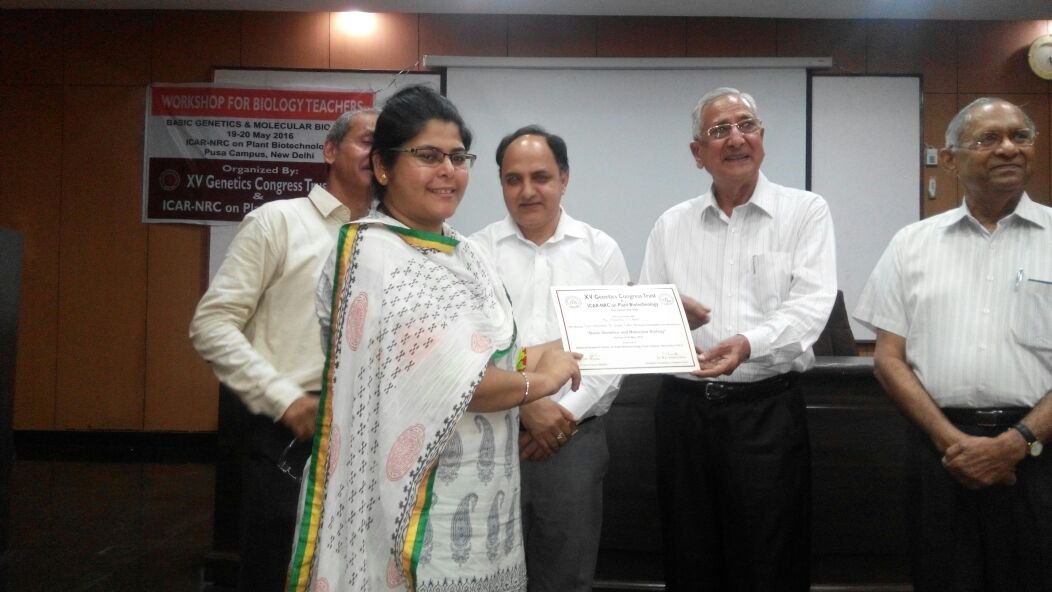 XV Genetics Congress Trust, organization of eminent geneticist under the chairmanship of Dr. M.S Swaminathan, conducted a 2 days workshop for PGT Biology teachers of Delhi on 19th and 20th May 2016. The topic of the workshop was Basic Genetics and Molecular Biology. The venue of the workshop was National Research Centre on Plant Biotechnology. Both days were divided into two sessions. Lectures were delivered by eminent scientists on various topics related to CBSE curriculum in the form of presentations. The topics of the lecture were Gene cloning, Genetics, RNA and DNA fingerprinting and Human Genome. All the topics were quite informative. The practical topics were DNA Isolation, PCR, DNA restriction, Preparation of competent cells, Transformation, Blue white selection. The students saw the first Gene Gun, DNA sequencers, confocal microscopes. The workshop was attended by Mrs. Namrata Jit Kaur.